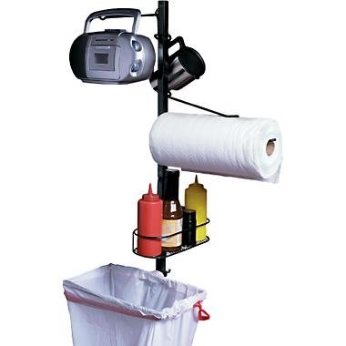 Camping Portable Organizer that clamps conveniently on a table/grill or stakes in the ground for added use. Has a Bendbrite Hands-Free Flex-Light, Radio/lantern holder, paper towel holder, adjustable condiment rack, movable utensil hooks, waste bag hoop, durable carry and storage bag.